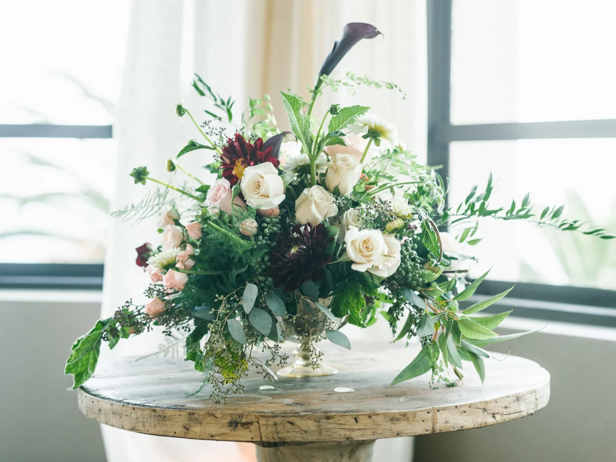 The floral arrangements were all about playing with color and texture. Each arrangement varied in its form, which only added to the relaxed nature of the space. Soft pinks, light oranges, romantic reds, and pops of lush greenery were the perfect fit for this environment.