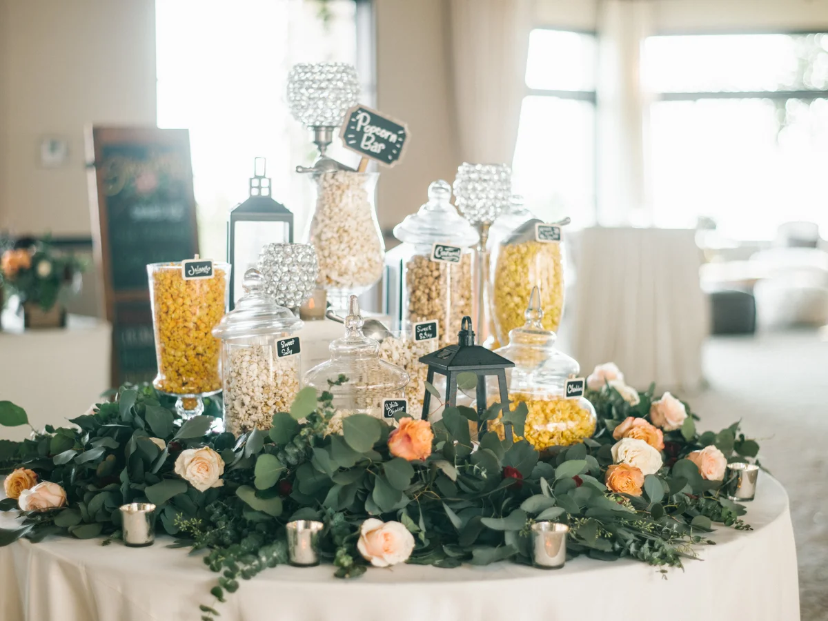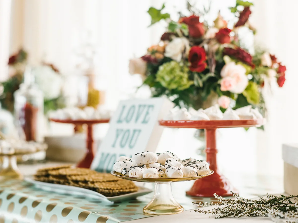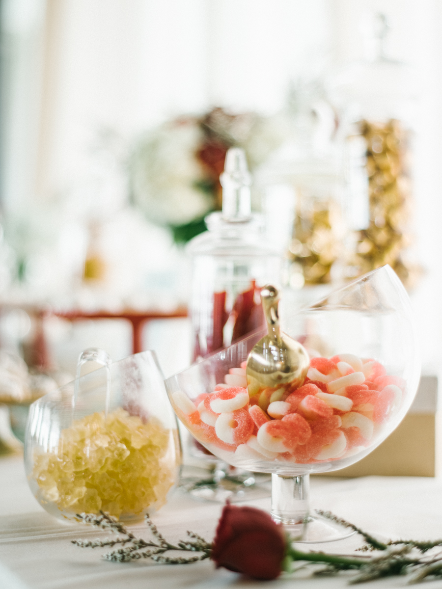 Adding florals to any dessert bar, candy table, or food station adds another dimension to your event. Use florals to accentuate the color of something, like these candies—the florals really made this table pop!